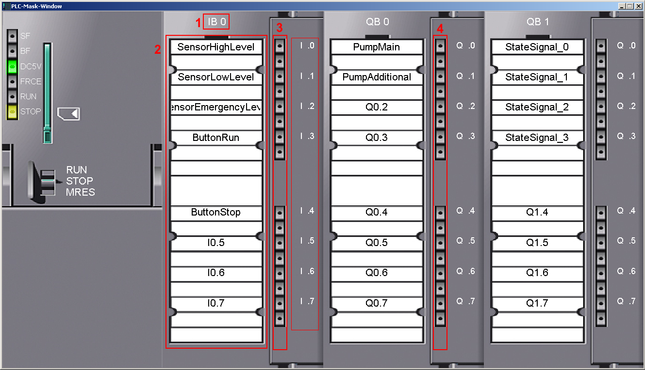 Приклад налаштованої моделі ПЛК наведено на рис. 41.. У верхній частині модуля вказується його тип та адреса (1). Якщо виконати подвійне натискання по модулю введення або виведення, відкриється вікно налаштування модуля, в якому можна змінити його адресу. На модулях відображаються символьні імена змінних, що відповідають адресам (2).