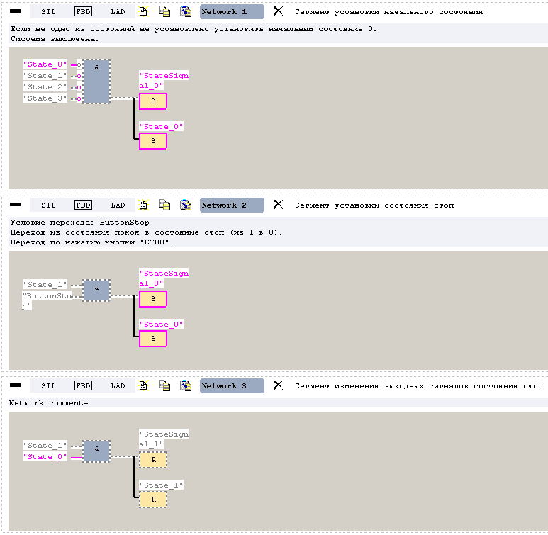 Для зберігання стану системи обрані меркери, що представляють собою бітові змінні: M 0.0, M 0.1, M 0.2, M 0.3. Оголошені змінні будуть використовуватись для фіксації знаходження системи у відповідному стані. Якщо змінна встановлена система перебуває у відповідному змінному стані. При переході з поточного стану в новий, в сегменті установки стану проводиться запис у відповідний меркер значення "1", далі в сегменті зміни вихідних сигналів виконуються зміни сигналів, після цього змінна стани, з якого виконувався перехід, скидається в "0". >