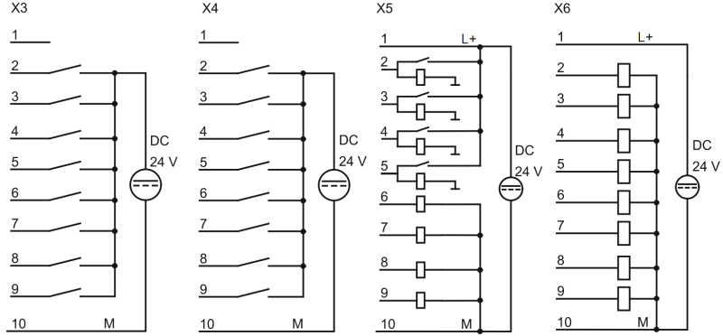 За допомогою роз'єму X1 (1) до контролера підключається живлення 24 В. Контролер має два порти входів підключені до роз'ємів X3 (2) (DI 8xDC24V), X4 (3) (DI 8xDC24V), один порт входів/виходів підключений до роз'єму X5 ( 4) (DIO 4/DO 4xDC24V) молодший зошит якого може бути налаштований як входи або виходи і один порт виходів підключений до роз'єму X6 (5) (DO 8xDC24V). Входи та виходи гальванічно розв'язані та працюють з 24 В сигналами. Структура входів та виходів портів представлена на рис. 6.. Підключення до портів представлено на рис. 7..