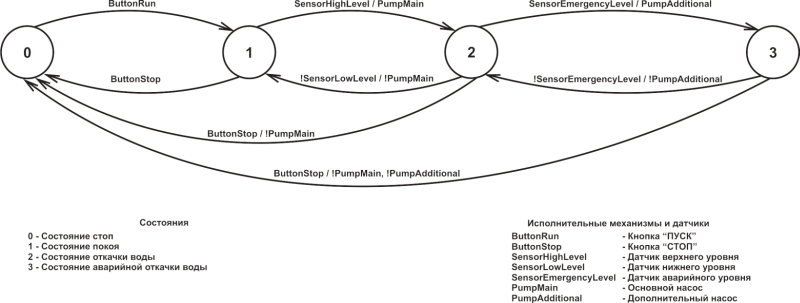Система переходить зі стану 1 до стану 2 при спрацьовуванні датчика верхнього рівня. При відключенні нижнього рівня датчика відбувається перехід зі стану 2 в стан 1.