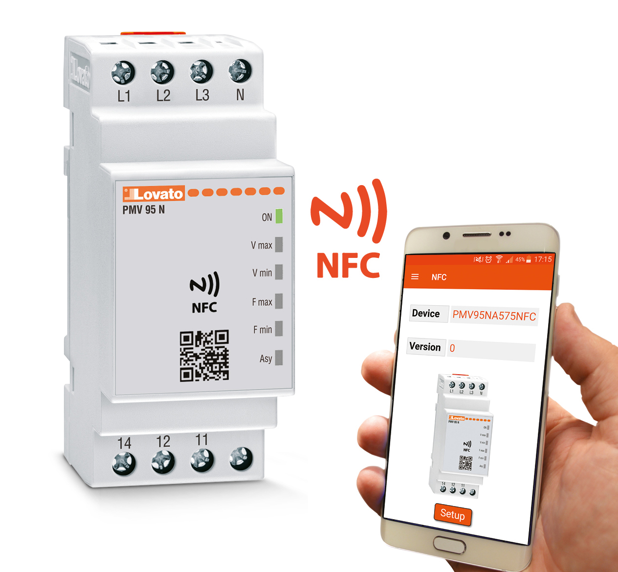 - Налаштовується через Андроїдні пристрої, що мають NFC (автоматичне визначення і підключення до пристрою) і ПО LOVATO NFC APP. Це дозволяє отримати точні і надійні налаштування параметрів реле (межі і час спрацьовування)