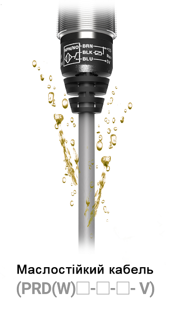 Датчик серії PRD оснащується кабелем, стійким до навантажень на розтяг. Сполучні компоненти такого кабелю мають підвищену міцність на вигин. Завдяки цим властивостям забезпечується надійність і довговічність датчиків при вигині кабелю (крім моделі PRDT08-… DO-…).