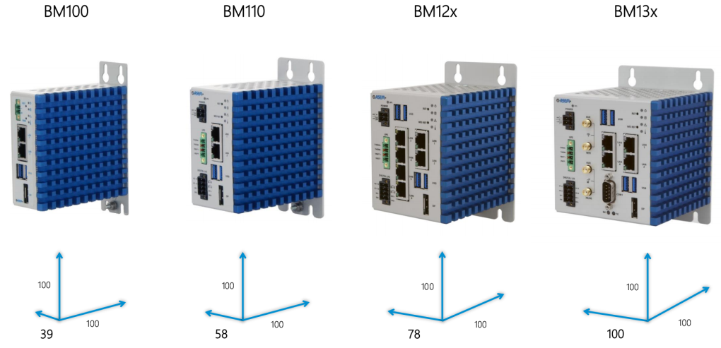 IPC BM1xx базуються на процесорах Atom платформи Intel Apollo Lake. Залежно від моделі вони обладнуються портами Gigabit Ethernet, USB 3.0, багатостандартним COM-портом, вбудованим модулем Wi-Fi та 4G модемом. Для моніторингу та керування живленням IPC обладнано двома цифровими входами та двома цифровими виходами. Також ці канали доступні для керування з програми користувача. Деякі моделі обладнано контролером безперебійного живлення UPS з можливістю підключення зовнішньої батареї NiMH. IPC BM1xx оснащені міцним та елегантним алюмінієвим радіатором для ефективного відводу тепла. Постачаються у трьох варіантах кріплення
