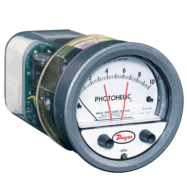 Автоматична система керування очищенням фільтрів створена за допомогою комбінації датчика серії A3000 Photohelic® та контролера часу серії DCT500A. Датчик Photohelic® контролює фільтри на предмет скупчення пилу. Коли накопичення пилу та падіння тиску на фільтрах перевищують задану межу, датчик Photohelic® активує цикл очищення DCT500A. DCT500A контролює процес очищення, доки рівень пилу та відповідний перепад тиску на фільтрах не опуститься нижче заданої межі. Для запобігання попадання частинок пилу у манометр Photohelic® рекомендуються наконечники статичного тиску та магістральні фільтри.