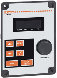 Нові приводи змінної швидкості VT1 можна запрограмувати за допомогою встановлених на передній панелі клавіатури та дисплея. Параметри розділені на функціональні групи для полегшення ідентифікації користувачем, що робить введення в експлуатацію та саму експлуатацію швидкою та зручною для користувача. Як альтернативу звичайному програмуванню з фронтальною клавіатурою, привід VT1 можна програмувати віддалено з ПК за допомогою програмного забезпечення VT1X SW від LOVATO Electric, яке не тільки дозволяє встановлювати параметри пристрою, але також контролює його робочий стан і електричні значення. VT1 підключається до ПК за допомогою додаткового кабелю USB VT1X C01, тоді як програмне забезпечення VT1X SW можна безкоштовно завантажити з www.lovatoelectric.com.