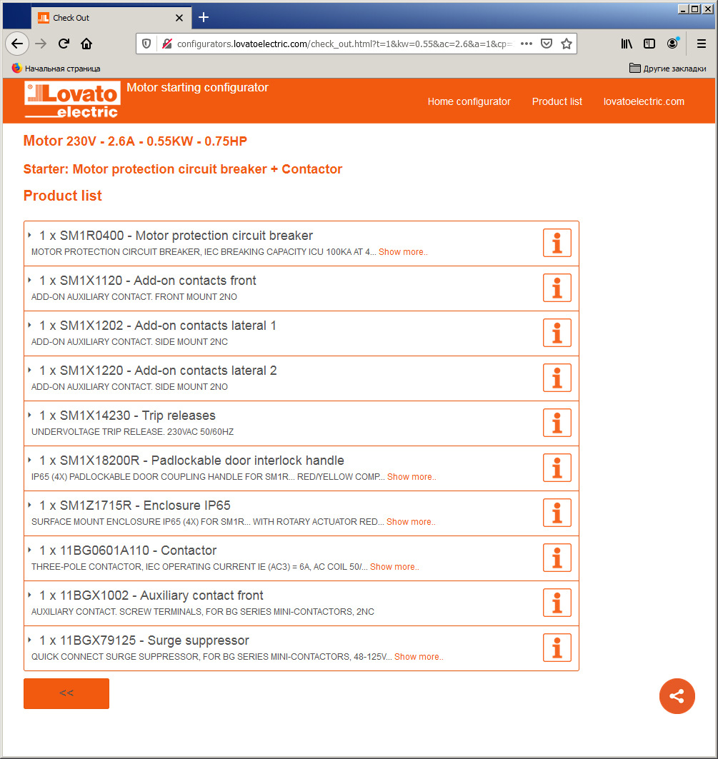 Також конфігуратор рекомендує тип і номінал захисного обладнання (запобіжники, автоматичні вимикачі, теплові реле) для двигуна, а після завершення роботи видає список підібраних пристроїв з посиланнями на їх характеристики.