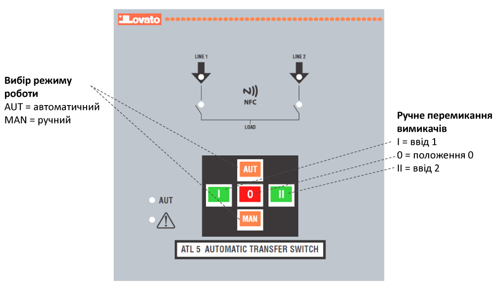 Передня панель і світлодіодні індикатори на передній панелі забезпечують просту і чітку візуалізацію стану системи ATS. Вбудований зв'язок NFC дозволяє встановлювати номінальні параметри, пороги захисту, налаштування перемикання, функції вводу/ виводу тощо за допомогою пристроїв Android і додатку LOVATO NFC, що робить програмування простим, інтуїтивно зрозумілим і не вимагає використання сполучних кабелів.