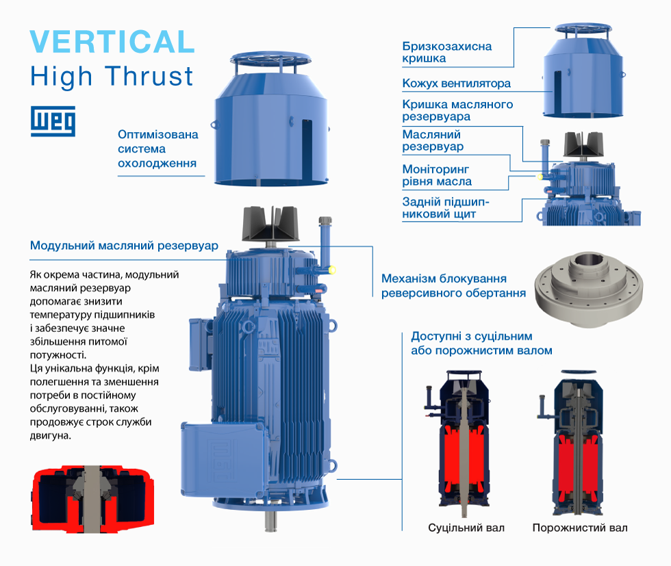 Vertical High Thrust — це інноваційний продукт, який має два запатентованих рішення в системі змащення підшипників. Перевагою цього електродвигуна є наявність модульного масляного баку з системою теплообміну, що допомагає знизити температуру та подовжує час роботи підшипника, покращуючи продуктивність та строк служби двигуна. Ці нововведення спрямовані на оптимізацію простору на заводі за допомогою вертикальної установки електродвигуна, на додаток до спрощення та зменшення потреби в постійному обслуговуванні.