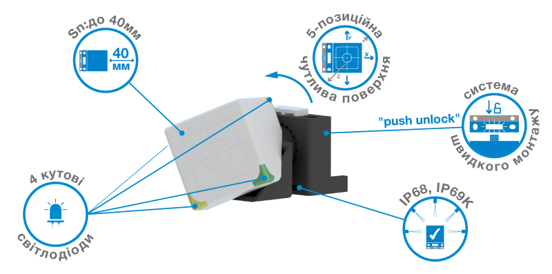 Дана лінійка забезпечує гнучке налаштування та можливість адаптації до будь-якого положення на монтажній поверхні завдяки п’ятипозиційній сенсорній поверхні. Датчики IRC40 можна швидко встановити без будь-яких інструментів завдяки системі швидкого монтажу.