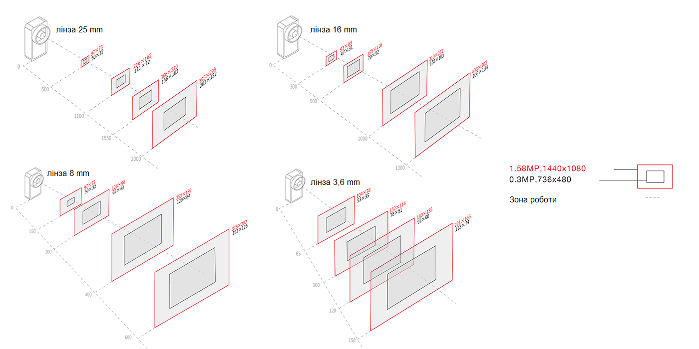 | Лінзи | S-Mount, 4 фокусні відстані: 3.6, 8, 16, 25 мм | |