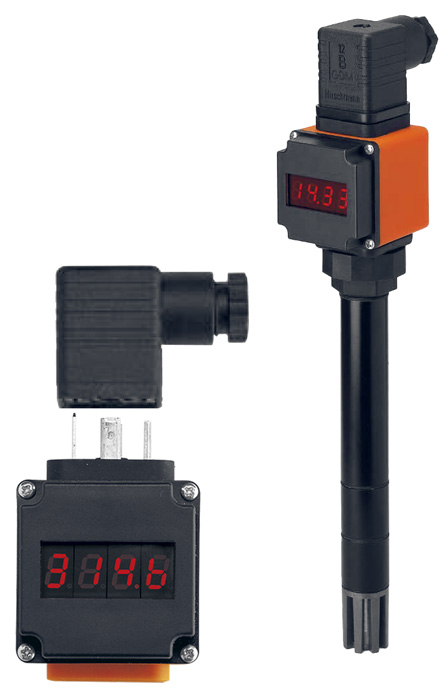 Додатковий плагін-дисплей живиться струмом вимірювального кола та дозволяє зчитувати виміряне значення безпосередньо на пристрої без додаткового джерела живлення. Додатково можна замовити вільно програмований комутаційний вихід. Датчики з асортименту поставляються з алюмінієвим сенсорним блоком і марлевим фільтром. Підключення здійснюється за допомогою прямокутного штекера стандарту DIN 43650.