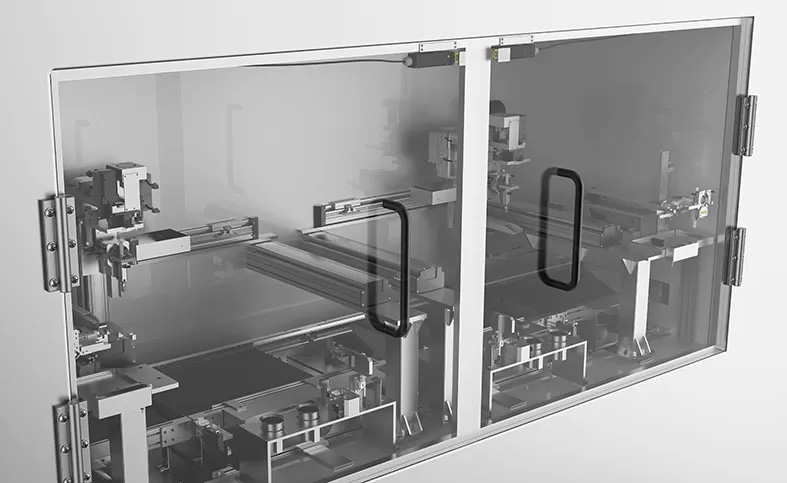 Пакувальні машини. Захисні пристрої блокування дверей на пакувальних машинах. Вони забезпечують блокування дверей під час роботи обладнання. Двері можна відкрити лише після зупинки процесу та за умови, що відчинення є безпечним.