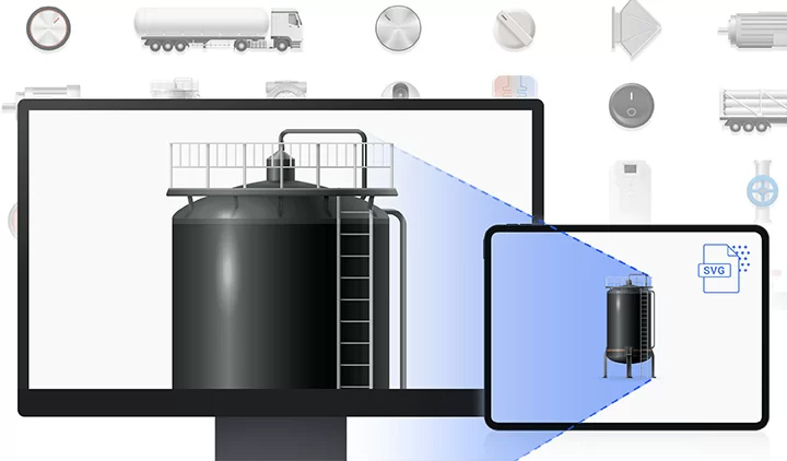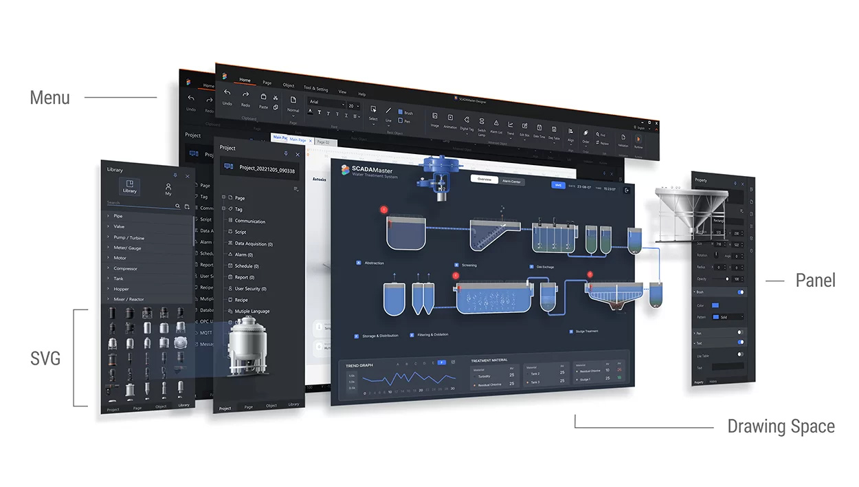 Спеціалізоване програмне забезпечення для редагування екранів SCADAMaster-Designer забезпечує інтуїтивно зрозумілий та зручний графічний інтерфейс, який користувачі можуть легко використовувати завдяки модульній панелі та простому налаштуванню екрана. Бібліотека зображень у форматі SVG (масштабована векторна графіка) включає різні промислові об'єкти, щоб користувачі могли створювати візуалізації технологічних процесів з елементами, подібними до реальних об'єктів.