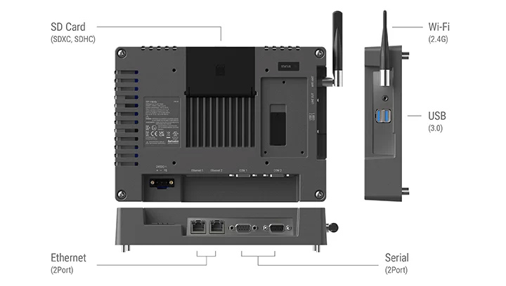 Графічні панелі iTP підтримують різні комунікаційні інтерфейси, включаючи 2 послідовних порти, 2 порти USB (2.0/3.0), 2 порти Ethernet, Wi-Fi (2.4G, з підтримкою антени) та SD-карту на 256 ГБ (SDXC, SDHC) для максимальної зручності використання із зовнішніми пристроями залежно від середовища користувача.
