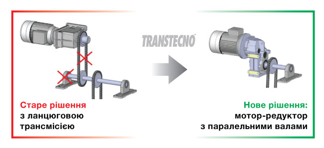 У певних ситуаціях циліндричний мотор-редуктори з паралельними валами може бути використаний для усунення зайвого використання ланцюга, як показано нижче.