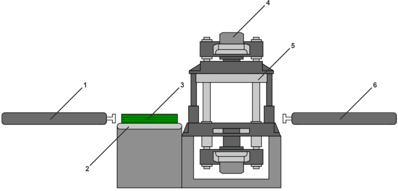 Перемещение пакета с рольганга на пресс и с пресса на рольганг осуществляется при помощи электромеханических толкателей (1, 6). Выдвинутое и задвинутое положение толкателей определяется при помощи концевых датчиков. В выдвинутом положении толкатель рольганга (1) позиционирует пакет под прессом, а толкатель пресса (6) позиционирует готовый ламинат на рольганге. Управление направлением движения толкателя осуществляется при помощи пускателей.