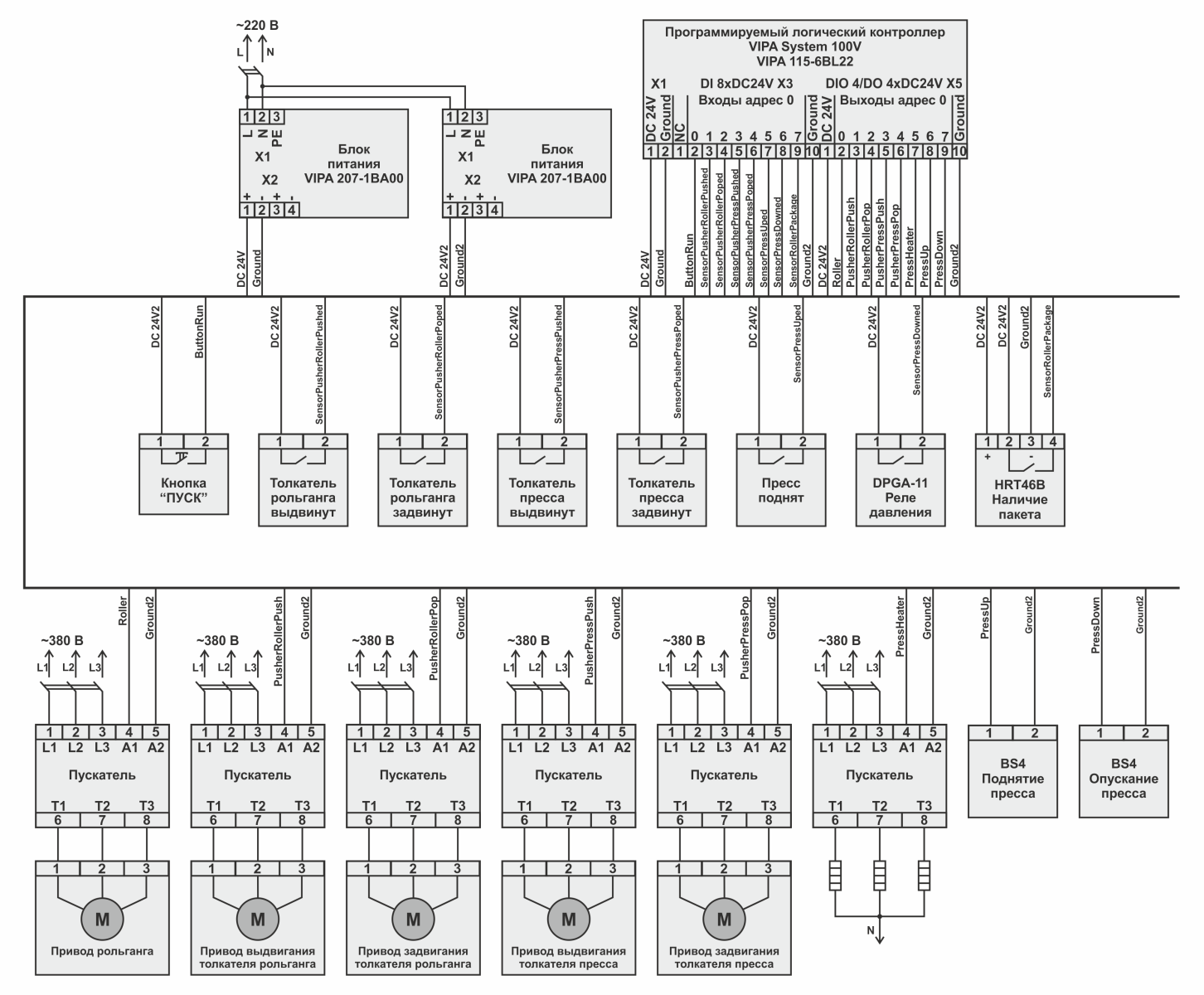 Для системы управления гидравлическим прессом была разработана схема электрическая принципиальная. Используя данную схему, участники олимпиады во время выполнения задания должны были разобраться с типами датчиков и условием их срабатывания, а так же с типами исполнительных устройств и принципами их переключения.