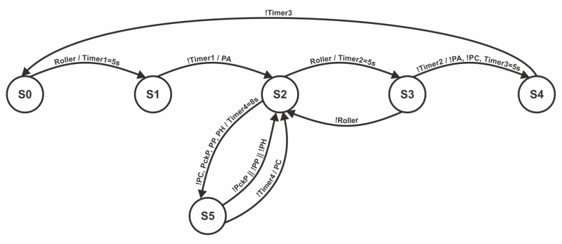 По умолчанию модель находится в состоянии покоя (S0). При включении рольганга (Roller) модель переходит в состояние подготовки пакета (S1) и запускает таймер (Timer1) на пять секунд. По истечению времени (!Timer1) модель переходит в состояние наличия пакета (S2), при этом на рольганге появляется пакет (PA). Если рольганг включен (Roller), система переходит в состояние подготовки ухода пакета (S3) и запускает таймер (Timer2) на пять секунд. Если рольганг выключается (!Roller), система переходит в состояние наличия пакета (S2). По истечению времени (!Timer2) модель переходит в состояние ухода пакета (S4), при этом пакет уходит (!PA), цвет пакета становится стандартным (!PC), и запускается таймер (Timer3) на пять секунд. По истечению пяти секунд (!Timer3) модель переходит в состояние покоя (S0).