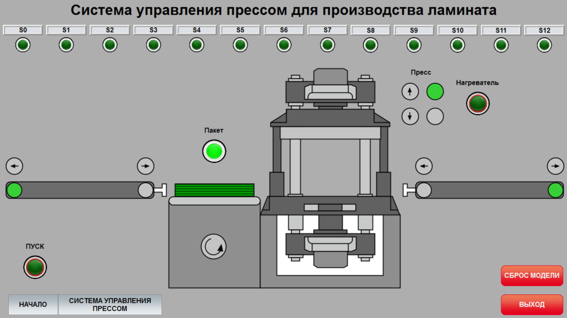 Модель объекта управления была разделена на несколько отдельных элементов, каждый из которых реализовывался своей моделью: пакета, толкателя с рольганга на пресс, толкателя с пресса на рольганг и самого пресса. Наиболее сложной моделью оказалась модель пакета, так как необходимо было реализовать появление его на рольганге, уход с рольганга, изменение пакета в процессе термической обработки. Все это было реализовано на базе графа состояний.