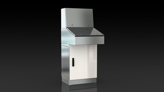 Средняя часть пульта EUPU-M: корпус, столешница на шарнирах сзади и замками, 2 фиксатора с автоматической фиксацией, крышка верхнего отверстия. Вырез для ввода кабеля в основании корпуса, ключ, упаковка.