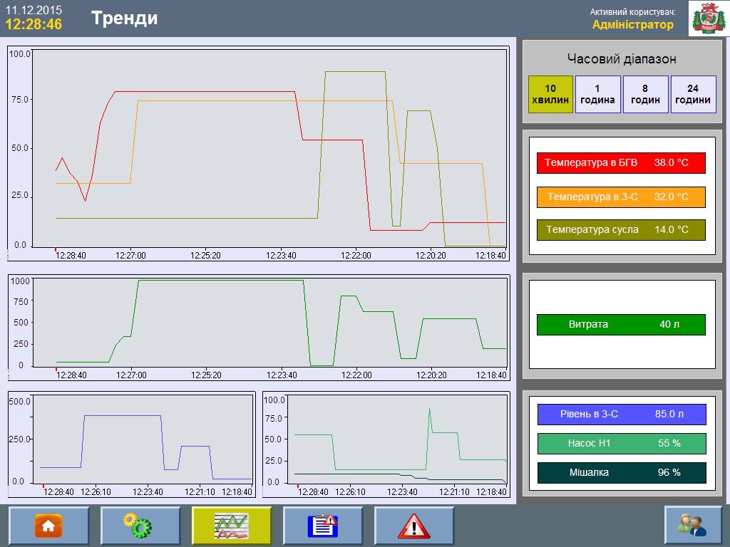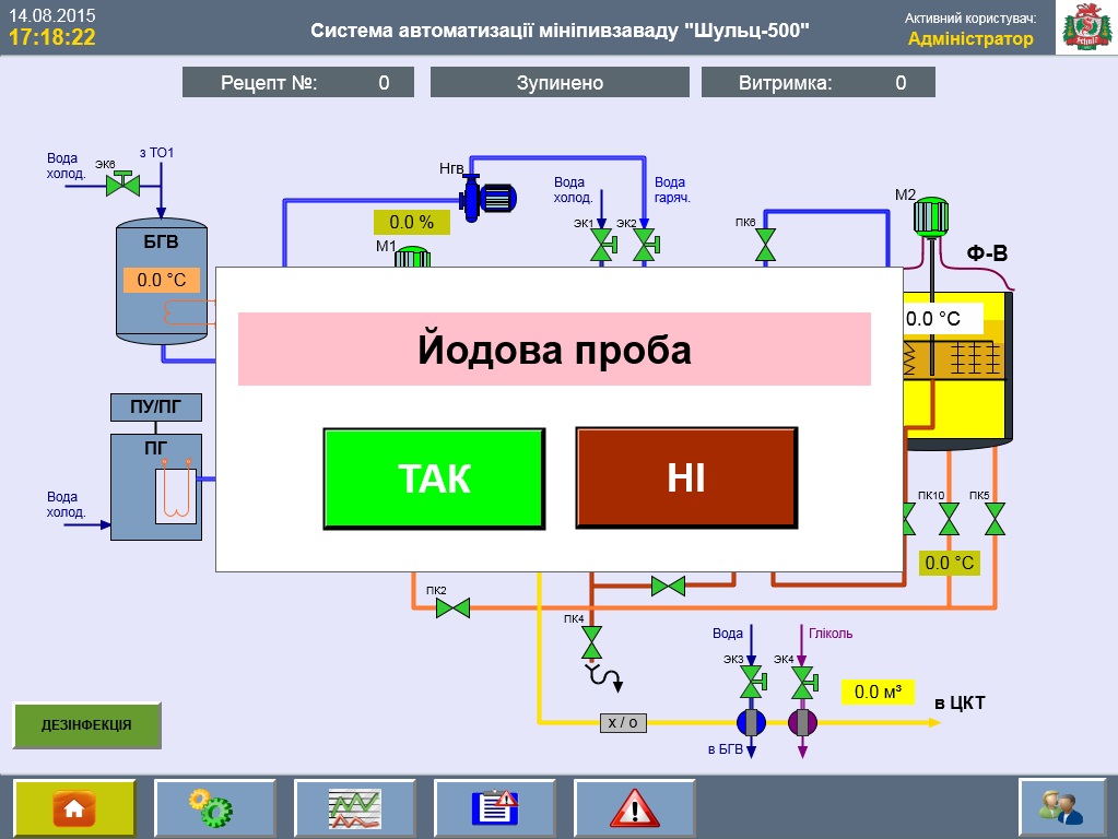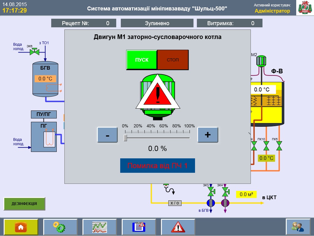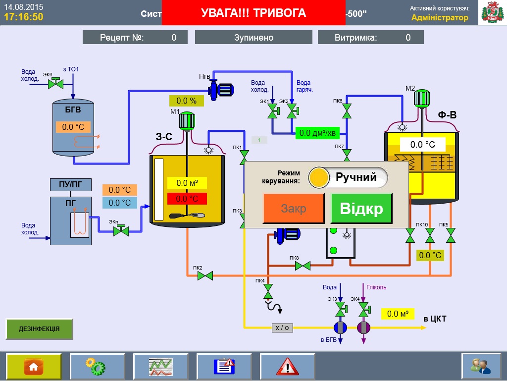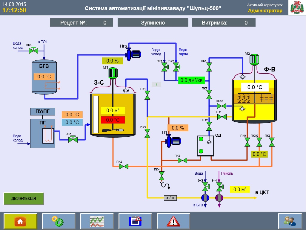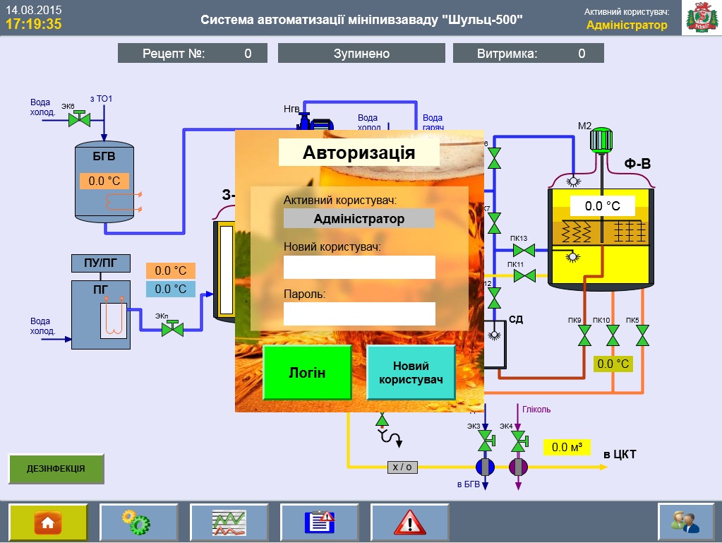Система призначена для керування і контролю процесу виробництва пива, візуальне спостереження за процесами, відображення робочих параметрів, температур і стану виконавчих механізмів на панелі оператора.