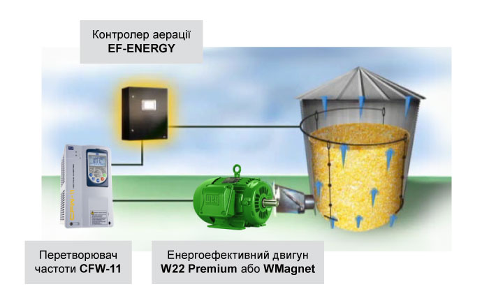 Рішення полягає в застосуванні енергоефективних двигунів W22 Premium або WMagnet, що керуються від перетворювача частоти WEG. При цьому сам перетворювач частоти інтегрується в наявну системи автоматизації шляхом підключення до контролера аерації EF-ENERGY, тому заміна системи термометрії (датчиків та кабелів) в елеваторах не є необхідною. Ілюстрація рішення показана нижче: