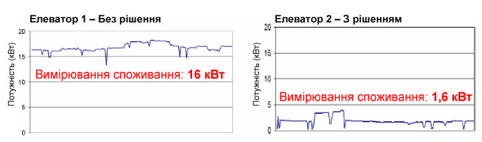 Вимірювання проводилися за допомогою аналізатора електричної мережі із вимірюванням струмів, напруг, активної і реактивної потужності. Порівняння споживання електроенергії між двома елеваторами представлене на графіках нижче:
