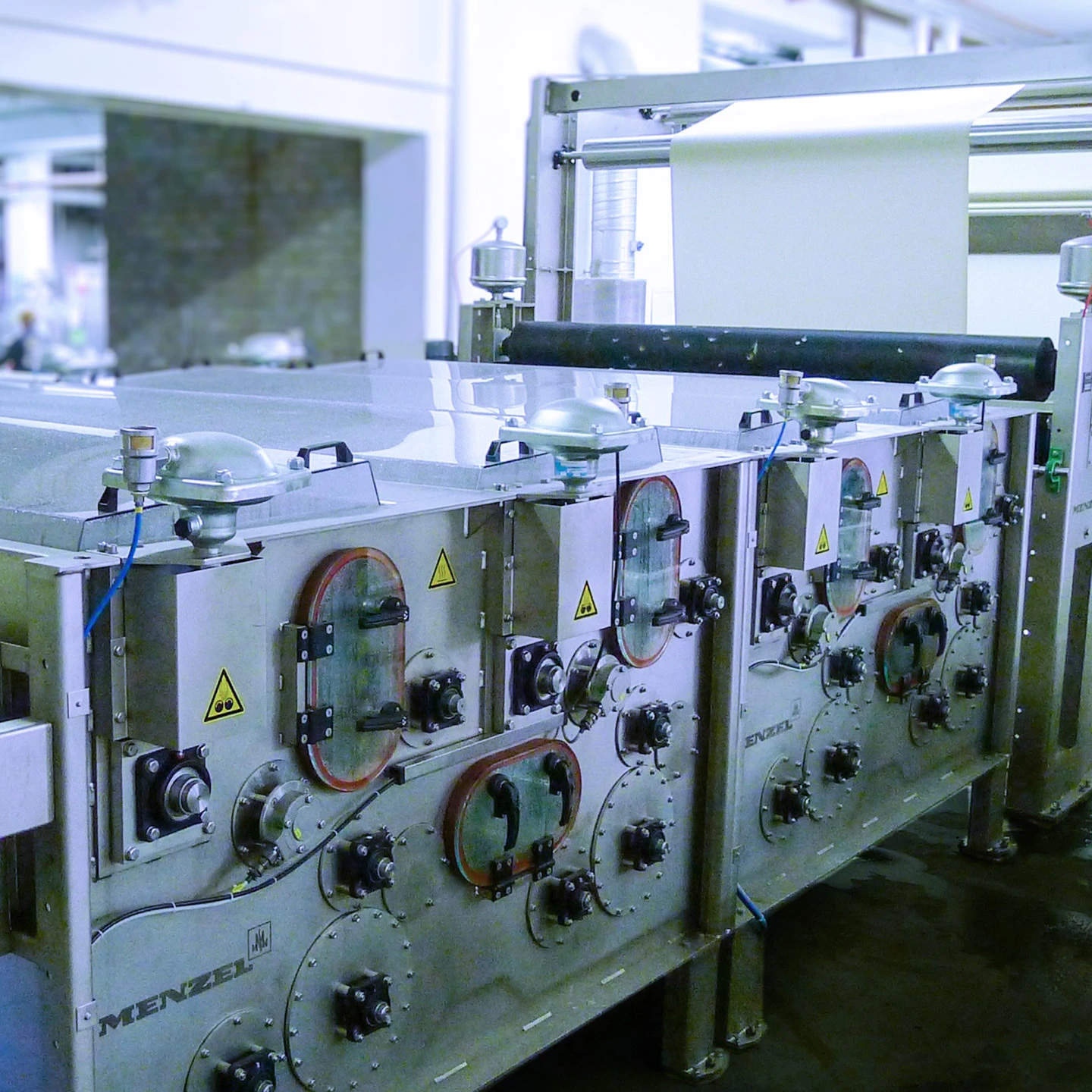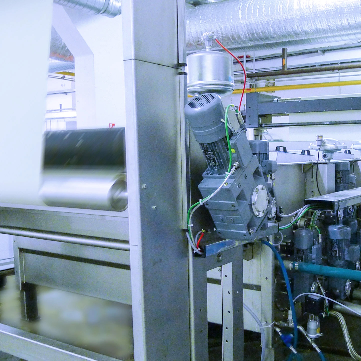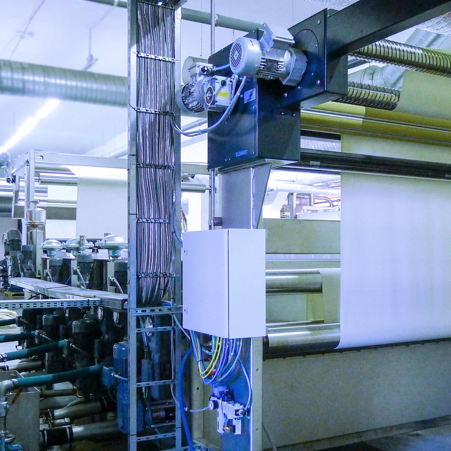 Для забезпечення такого процесу система керування має забезпечувати мінімальні моменти розтягування за допомогою сервоприводів. При цьому еластичність тканини не впливає на роботу системи. Це формує відповідно високі вимоги до алгоритмів і точності керування електроприводами і серводвигунами від компанії Lenze. «Ми спускаємося до сили розтягу в 10 Н на метр ширини тканини. Це практично нічого», — уточнює Вольфганг Фехнер, технічний менеджер з продажів компанії Menzel. І саме в цьому полягає особливе ноу-хау Менцеля, в надійній реалізації саме таких рішень для безперервно діючих систем.