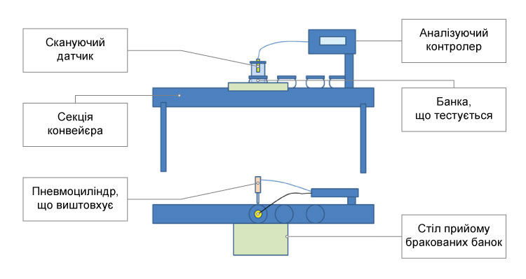 Фахівці СВ АЛЬТЕРА Черкаси розробила та впровадила систему керування детектором вакууму. Детектор призначений для вибраковування банок, неякісно закупорених кришками типу twist off. Вибраковування відбувається за величиною прогину кришки вакуумом, що утворився. Пристрій змонтований на базі пластинчастого конвеєра, по якому переміщуються банки, що потрапляють в зону сканування. Результат сканування аналізується та звіряється з еталоном. При невідповідності до еталону банка виводиться із потоку пневматичним пристроєм.