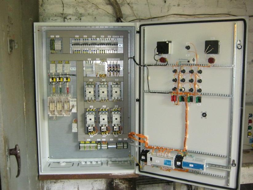 Для керування роботою насосної станції вибрано контролер ПЛК110-60. Незважаючи на деяку надмірність за кількістю входів/виходів, наявність одразу двох вбудованих інтерфейсів RS485 дозволяє розділити локальну мережу всередині шафи та зв'язок з пультом моніторингу, що за будь-яких неполадок з кабелем (на жаль, крадіжка кабелю далеко не рідкість) забезпечить працездатність системи. Для підвищення надійності зв'язку застосовано репітер RS485 – АС5 фірми ОВЕН. Для збору інформації з датчиків застосовано модуль МВА8.
