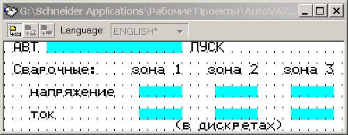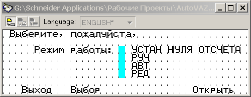 Основний людино-машинний інтерфейс реалізований на платформі операторської панелі типу MAGELIS від GROUPE SCHNEIDER, пов'язаної за інтерфейсом UNITELWAY із PLC типу Micro (PLC також від GROUPE SCHNEIDER). За його реалізації використано інтуїтивно-зрозумілий віконний принцип. Вікно вибору режимів роботи вказівником типу > , що циклічно вертикально переміщається, має вигляд: