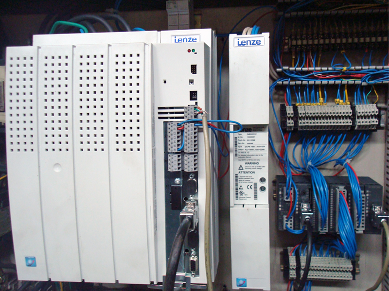 До дискретних входів ПЛК VIPA підключені елементи керування роботою установки, що відповідають за пуск та зупинення системи мірного різання. Також до ПЛК підключено сигнали фотоімпульсного датчика Kuebler, встановленого на валу ролика подачі труби. Дискретними виходами ПЛК через проміжні реле Relpol здійснюється керування котушками пневмоклапанів різання. Обмін даними між ПЛК VIPA та сервоперетворювачем Lenze 9300 Servo здійснюється за протоколом CANopen. Для розсіювання енергії гальмування механізму у схемі використовується гальмівний модуль EMB9352-E та зовнішній гальмівний резистор (на фото не вказано). Для високої точності синхронізації швидкості переміщення ріжучого інструменту та труби на вал двигуна переміщення ріжучого інструменту також встановлений інкрементальний фотоімпульсний датчик положення Kuebler.