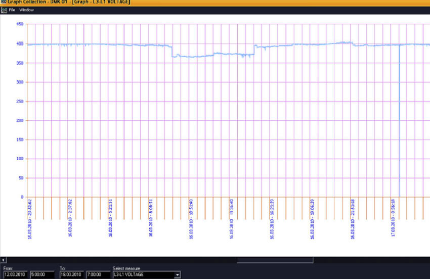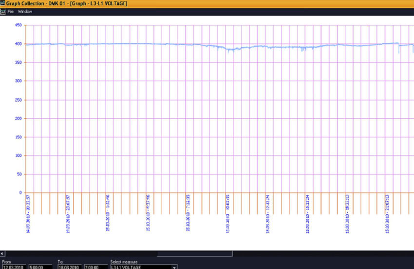 Для того щоб приймати якісь міри по покращенню електроживлення підприємства, спочатку треба було проаналізувати, які саме параметри електроенергії не відповідали вимогам обладнання. З цією метою був використаний аналізатор параметрів електромережі Lovato DMK 40 (вимірює до 251 параметрів електромережі). Так як прилад має функцію запису значень в часі, він був підключений на підприємстві протягом тижня. Нас цікавила якість напруги, яка подавалась на підприємство, нижче наведені деякі з графіків, які були побудовані в програмі DMKSW10 (програмне забезпечення до DMK40), на основі показів, знятих аналізатором мережі: