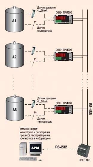 На кожному автоклаві встановлені температурний датчик типу ДТС065 і датчик тиску типу ПД 100 – ДІ. Датчики, у свою чергу, підключені до вимірювача двоканального ТРМ200. Прилади ТРМ200 змонтовані у шафі автоматики. У лабораторії технологів заводу чи іншому приміщенні встановлюється ПК із адаптером ОВЕН АС3-М. Через інтерфейс RS-485 вимірювачі ТРМ200 об'єднані в мережу та підключені до SCADA системи OWEN PROCESS MANAGER (OPM v 1.4).