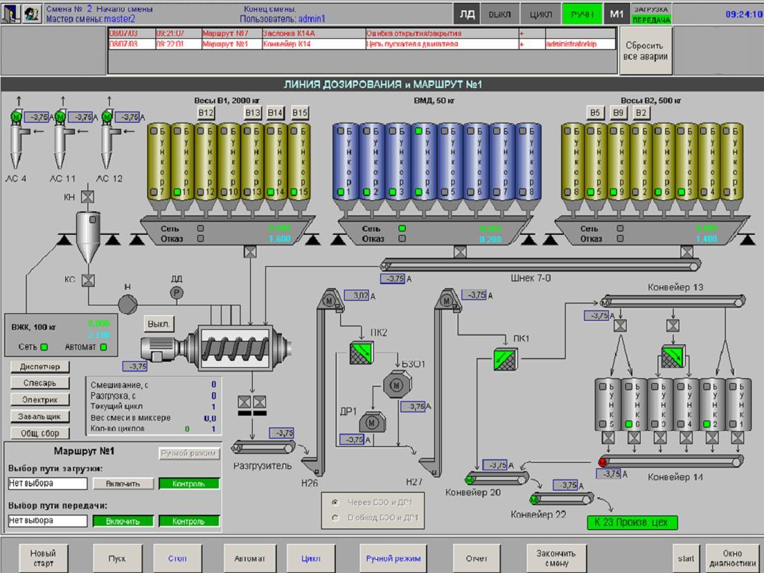 Лінія дозування складається з дозаторів компонентів суміші, ваг для зважування компонентів, змішувача. До складу об'єкта керування входить лінія дозування, що включає вагові системи, дозатори сухих компонентів, пристрої подачі рідких компонентів і змішувач. Дозування в автоматичному режимі відбувається згідно з заданим рецептом. Після запуску дозування набір компонентів у ваги відбувається автоматично. Після закінчення процесу дозування сировина надходить у змішувач, де змішується протягом заданого часу. Після цієї операції суміш надходить на наступний цикл дозування.