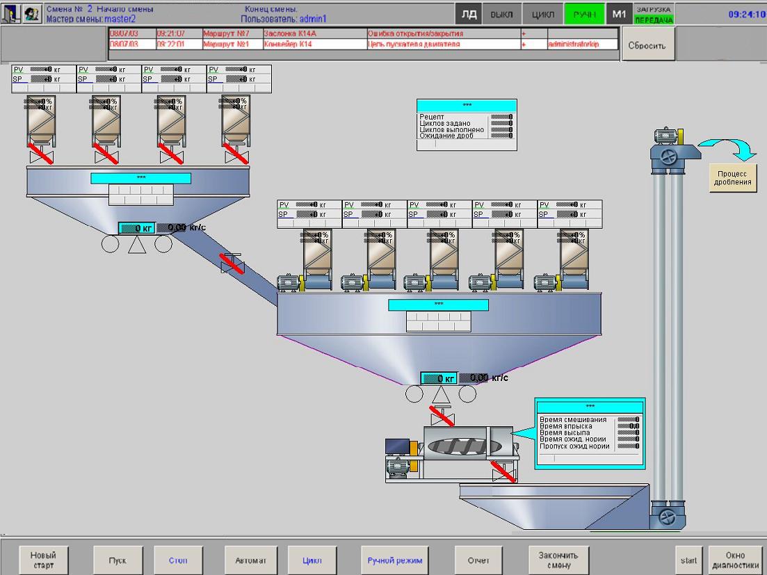 Рецептурні параметри задаються у диспетчерському пункті черговим оператором. Виконання окремих етапів процесу може здійснюватися як за місцем через локальні пульти керування, і з АРМ диспетчера. Після закінчення всіх циклів дозування та змішування формується звіт про кількість використаної сировини та загальний обсяг виробленого комбікорму.