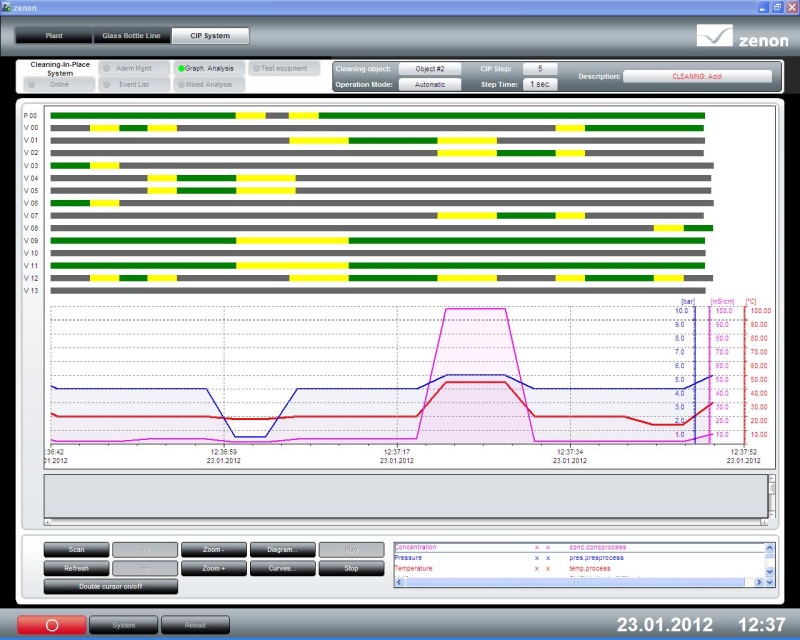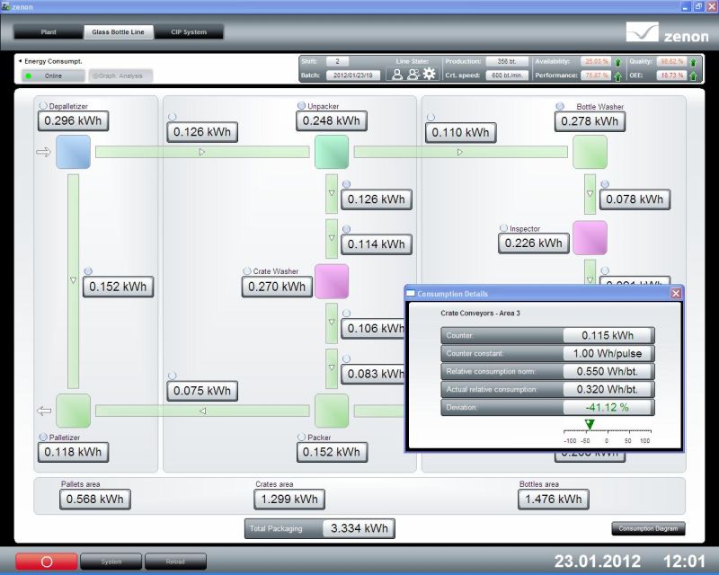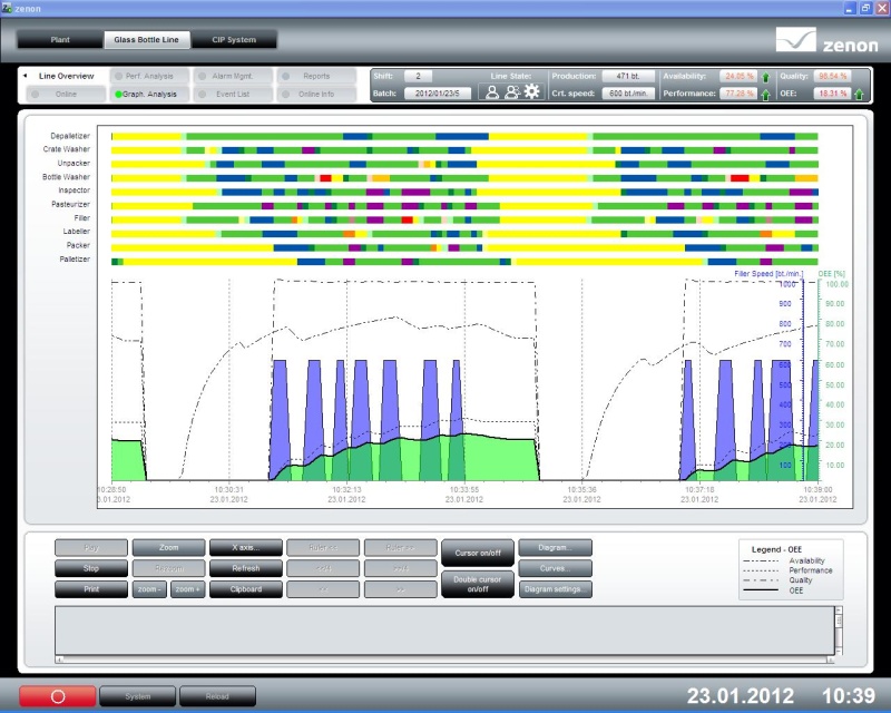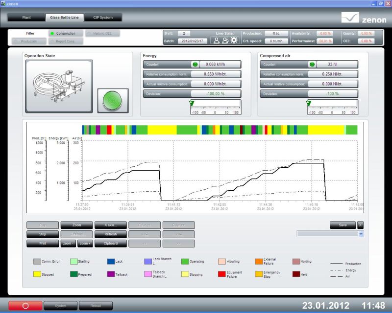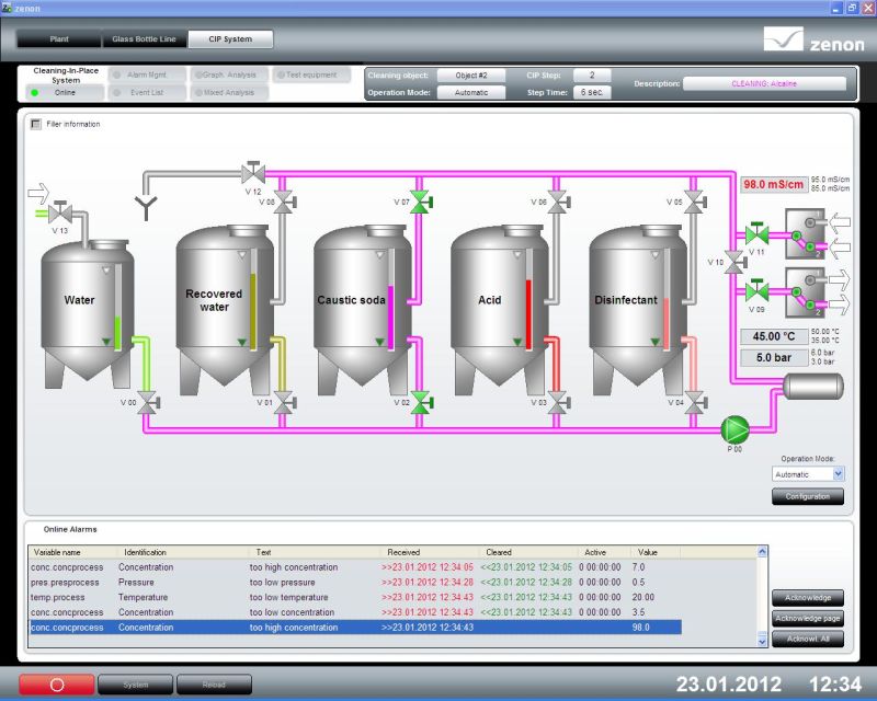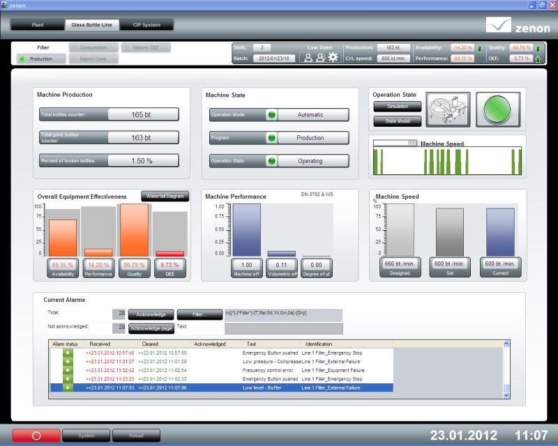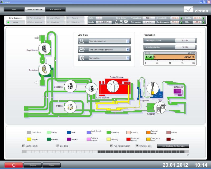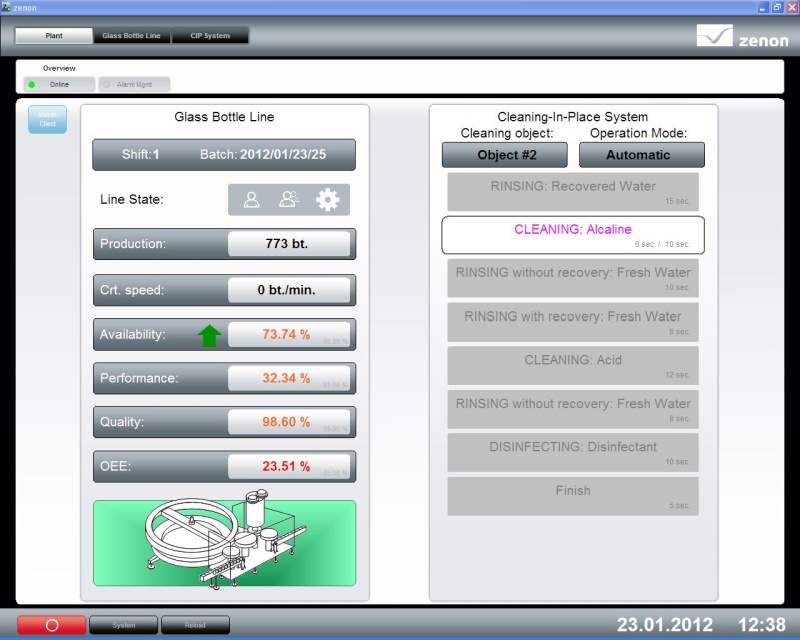 Нижче наведено приклад використання SCADA системи zenon при керуванні виробництвом напоїв із застосуванням комплексного підходу, що поєднує процеси розливу та процеси мийки/стерилізації танків зберігання продукту в єдину систему. Представлений проект дозволяє не тільки здійснювати моніторинг та керування виробництвом, а й здійснювати аналіз ходу процесу, автоматично обчислювати ключові індикатори (рівень якості, продуктивність, доступність обладнання) та генерувати на їх основі достовірні звіти.Візуалізація потокової лінії розливу продукту в тару здійснюється шляхом подання технологічного обладнання та сполучних конвеєрних ліній. У цьому процесі задіяно наступне обладнання: ополіскувач, моноблок розливу, закупорювальний автомат, інспекційні (бракеражні) машини, етикетувальний автомат для самоклейної або сухої паперової етикетки, моноблок укладання (формувальник-укладач-заклейник). За допомогою колірної індикації оператор інформується про поточний стан обладнання лінії: очікування, підготовка, робота, втрата зв'язку, аварійна зупинка.