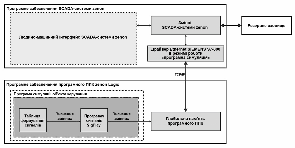 У зв’язку з відсутністю фізичної системи драйвер налаштований таким чином, щоб використовувати програмну симуляцію об’єкта керування на підставі програмного програмовного логічного контролера zenon Logic, що входить до складу SCADA системи zenon.