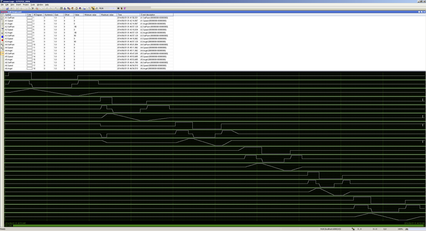 Перевірка правильності функціонування та відповідності висунутим вимогам розробленого програмного забезпечення програмного ПЛК zenon Logic виконується за допомогою програмного осцилографа "Soft Scope". Вікно осцилографа з діаграмами, що відповідають функціонуванню об’єкта керування, наведено на рис. 2.7.