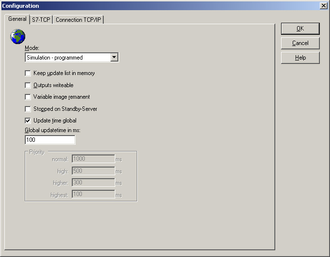 Виходячи з вимог до системи, дані програмовного логічного контролера повинні зчитуватися не рідше одного разу на 100 мс, відповідно до цього задано загальний час опитування "Global updatetime in ms" рівним 100 мс. Затримка часу з’єднання доступу до контролера "Reconnect delay" задана рівною 10 000 мс.