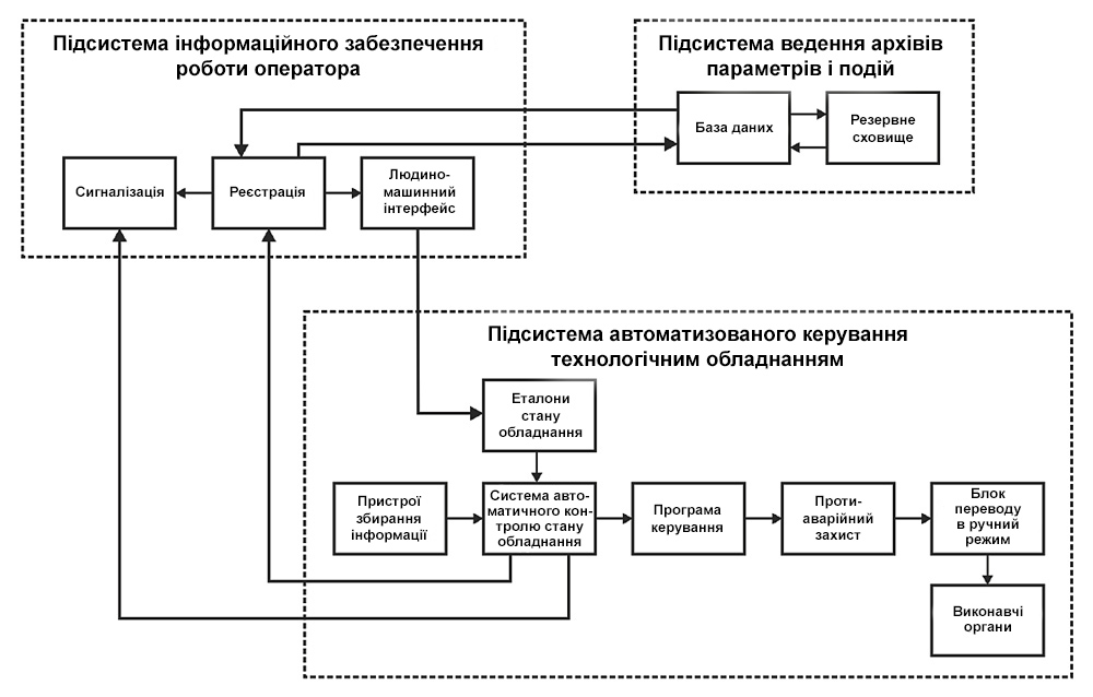 З урахуванням перелічених вимог функціональна структура системи має вигляд, наведений на рис. 1.2. Така структура системи забезпечує керування, збирання інформації, її реєстрацію, візуалізацію, збереження в базі даних та створення резервних копій. Крім того, забезпечується контроль за обладнанням та сигналізація досягнення параметрами керування заданих значень.