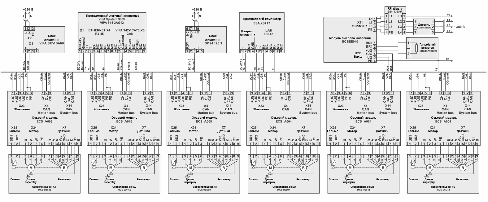 Зв’язок між програмовним логічним контролером та промисловим комп’ютером організований за допомогою інтерфейсу Ethernet, а з сервосистемою ECS за допомогою польової шини CAN. Як майстр польової шини CAN виступає програмовний логічний контролер VIPA 314-2AG12. Усередині сервосистеми ECS зв’язок між осьовими модулями також організований за допомогою шини CAN зі своїм майстром.