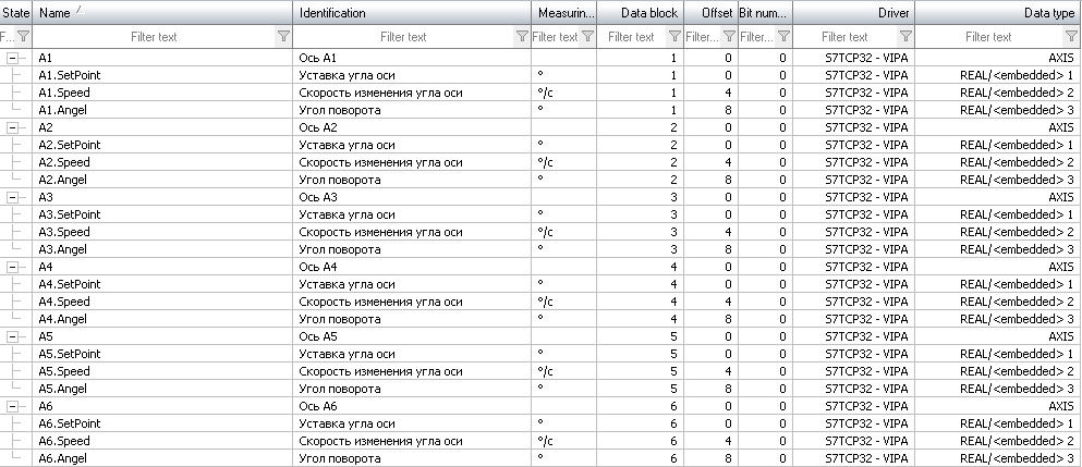 | 6 | Кут повороту осі A2 | DB2.DBD8 | Речовий | -190 ÷ +45° |