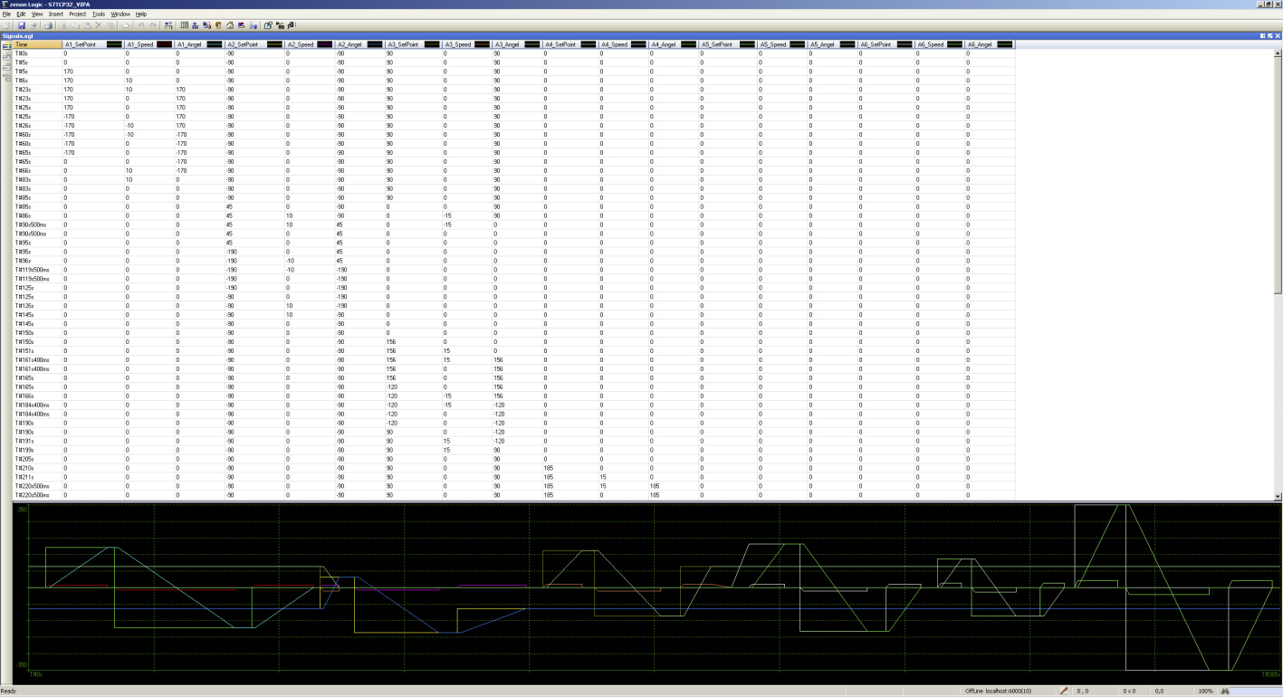 Розробка програми симуляції об’єкта керування виконується у два етапи. У першому етапі заповнюється таблиця сигналів. У таблиці для кожного сигналу вказується значення, що відповідає тимчасовій мітці та назві сигналу. Таблицю сигналів, заповнену відповідно до функціонування об’єкта керування, наведено на рис. 2.4.