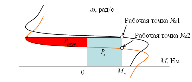 За допомогою рис.1 розглянемо причину виникнення цього явища. Нехай ми працюємо в робочій точці №1, причому з ланки постійного струму перетворювача споживається потужність Рн. Далі зовнішньою системою автоматики подається команда зниження швидкості і переході в робочу точку №2. Якщо величина допустимого прискорення/уповільнення приводу не обмежуватиметься, то кінетична енергія, запасена в механізмі вентилятора розкручуватиме вал електродвигуна вище синхронної швидкості, що задається перетворювачем. При цьому швидкість залишатиметься позитивною, а ось момент, який створюється двигуном, стане негативним і електропривод перейде в генераторний режим. У цьому випадку енергія рекуперації Ррекуп передаватиметься від двигуна до перетворювача частоти.