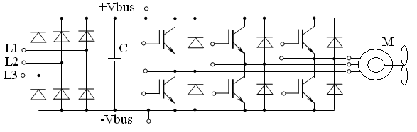 Електричні схеми силової частини більшості сучасних перетворювачів частоти схожі. Спрощена схема, представлена на рис.2, містить некерований випрямляч, фільтр ланки постійного струму та інвертор на IGBT-транзисторах із зворотними захисними діодами.